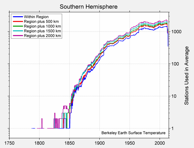 Fig. 3.1: Number of active weather stations in the Southern Hemisphere (1750-2013).