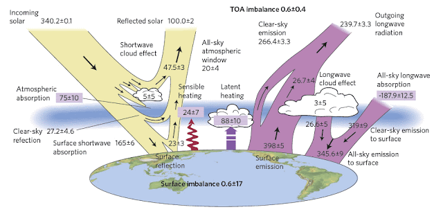 Bull. Amer. Meteor. Soc. 90 (3): 311–324). It is not necessarily the most definitive representation of the energy flows (as we shall see there are other models and significant disparaties and uncertainties in the numbers), but it is probably the most cited. The data it quotes specifically relates to the energy budget for the period March 2000 - May 2004.