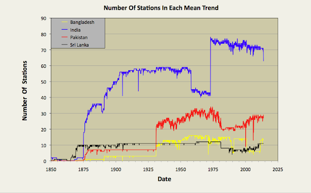It can be seen that the trends in Fig. 77.3 and Fig. 77.4 agree reasonably well, but close inspection suggests that the data in Fig. 77.4 is less noisy (look at the data spread) after 1960 than the equivalent data in Fig. 77.3, while the reverse is true for the period 1931-1960. The reason for this can be determined by examining the number of stations in the MTA calculation in each case as the plots in Fig. 77.5 below illustrate.