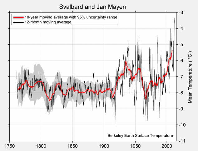 Fig. 118.5: Temperature trends for the Arctic above 68.5°N based on Berkeley Earth adjusted data. The best fit linear trend line (in red) is for the period 1876-2010 and has a positive gradient of +1.80 ± 0.05°C/century.